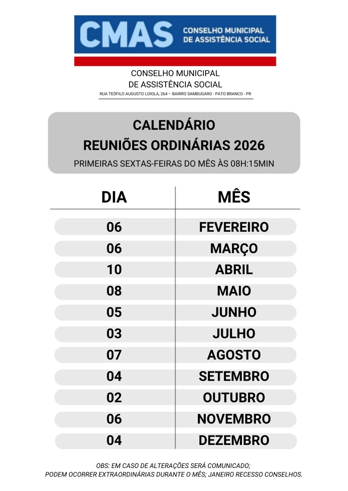Calendário das reuniões ordinárias do Conselho Municipal de Assistência Social em 2026